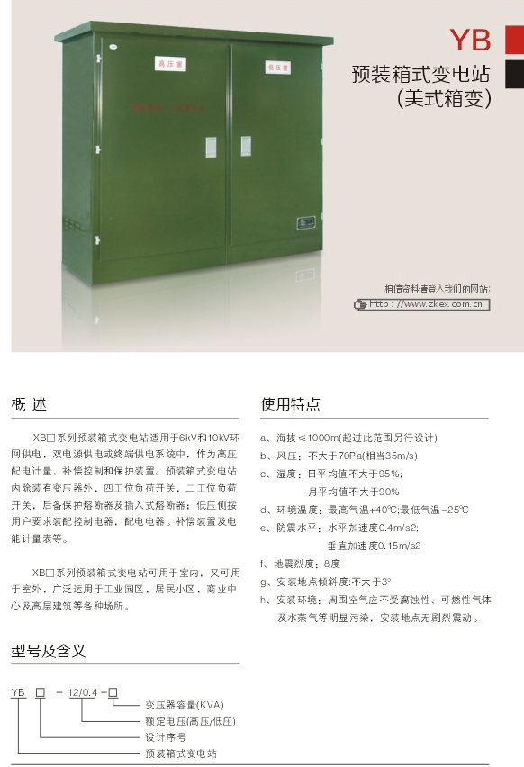 YB預裝(zhuāng)箱式變電站(zhàn)適用於6kV和10kV環網供電,雙電源供電或終端供電係統中,作為高壓配電計量,補償控製和保護裝置。預裝箱式變電站內除裝有變壓器外,四工位負(fù)荷(hé)開關,二(èr)工位負荷(hé)開關,後備保護熔斷(duàn)器及插入式熔斷器;低壓側(cè)按用(yòng)戶要求(qiú)裝配控製電(diàn)器,配電電(diàn)器。補償裝置(zhì)及電能計(jì)量表等。